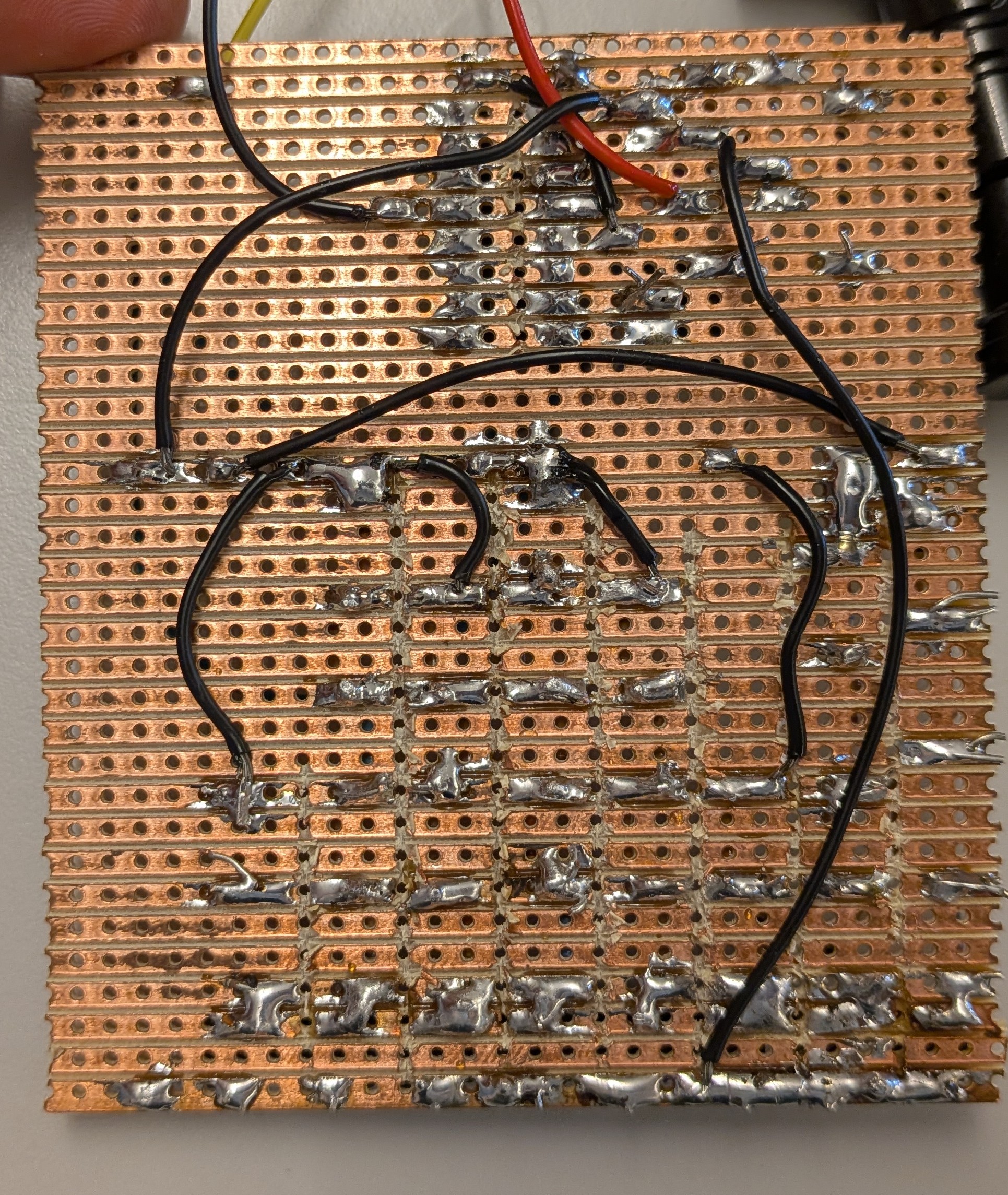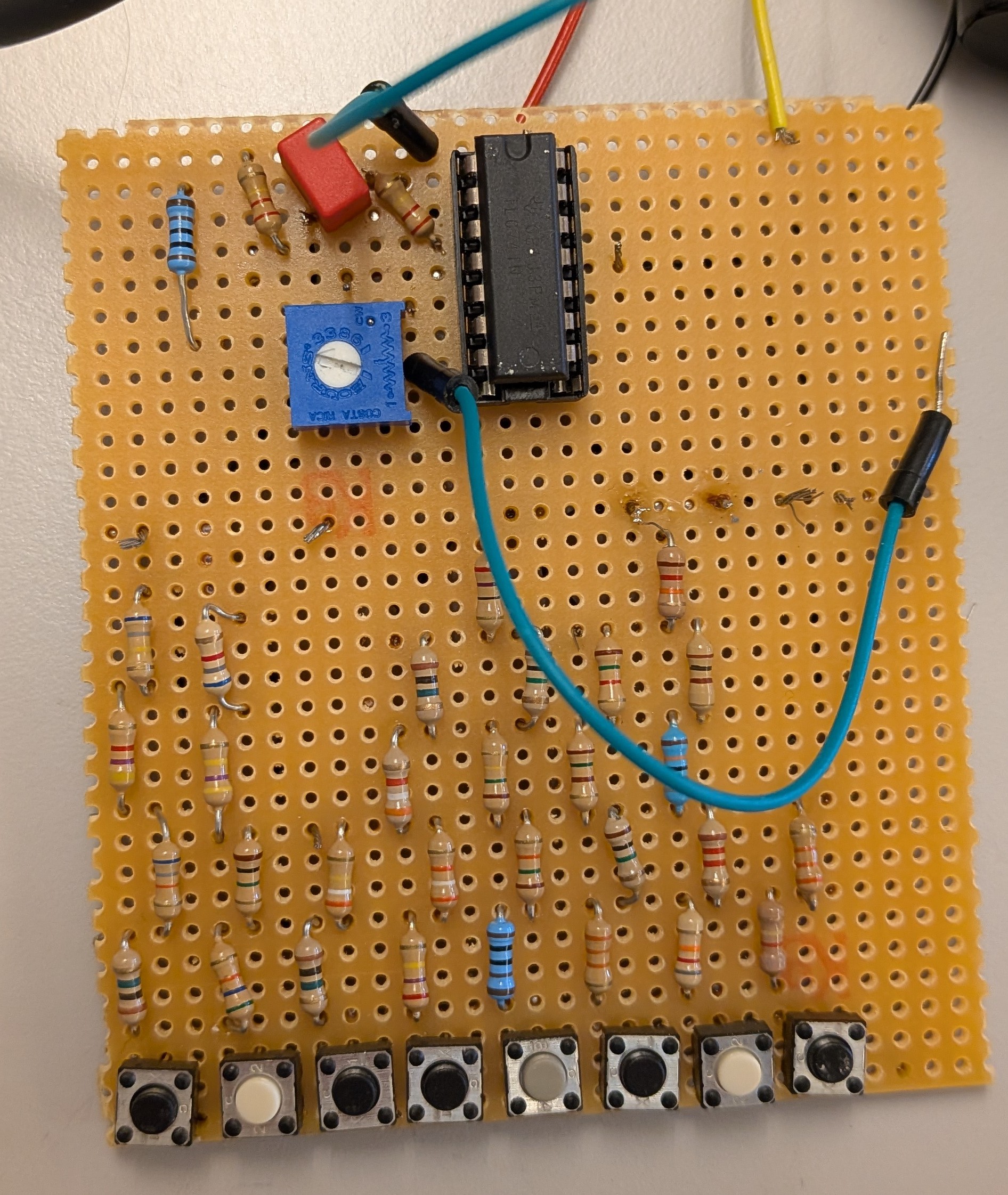 Första designen var en gjord på koplingskort, Här är en film när jag fick den att generera en signal, här är film när ja la till en spenings följare så att den kan driva en högtallare, och sedan så är här en film när tagenterna fungerar, allt deta var gjort på en fredag då jag inte hade någonting bätre att göra.